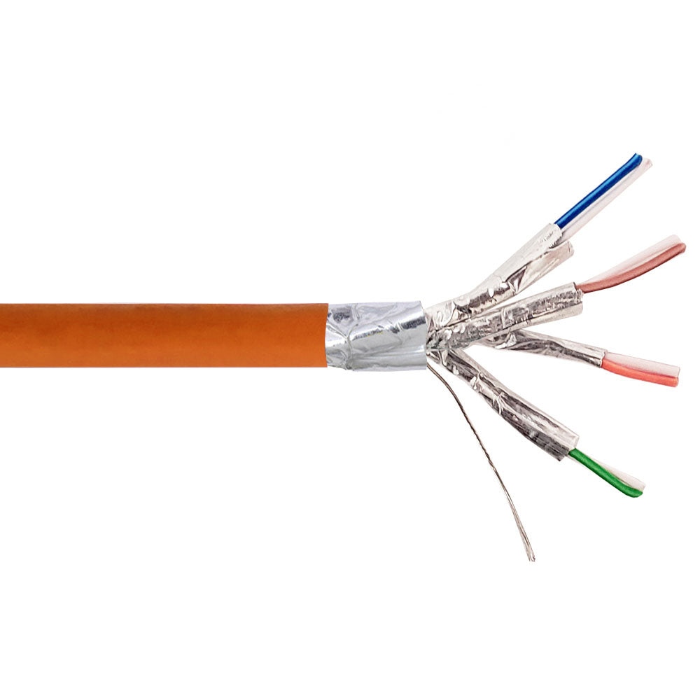 This cable comes in a pull box for easy pulling, it features color striped pairs for easy identification, and a rip cord for easy stripping. also it uses a shielded twisted pair (FFTP) structure to retain a high quality signal when passing near high voltage or power cables.