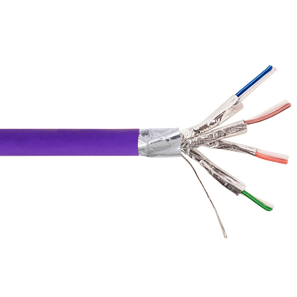 This bulk riser rated Cat6 cable is 1000 feet in length and consists of 4 pairs of 26AWG stranded wires with individually foil shielded pairs plus an overall foil shield. It is typically used to manufacture Cat6 shielded patch cables and terminated with shielded RJ45 plugs.