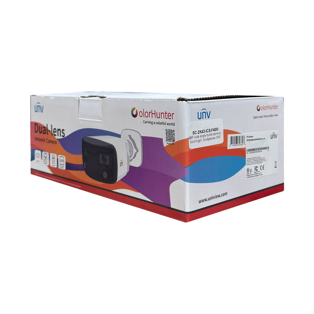 This 4MP wide angle bullet camera provides sharp, high definition images in daylight or nighttime color settings. The camera has two 4.0mm fixed lenses. Its maximum resolution is 3840*1080 at 25 fps and supports Ultra 265 video compression technology, which assures savings in bandwidth and storage. Its double lens splicing technology is adopted to realize the horizontal viewing angle of 160.00°±10° and colorhunter technology ensures 24-hour full-color images . It also features human body detection.