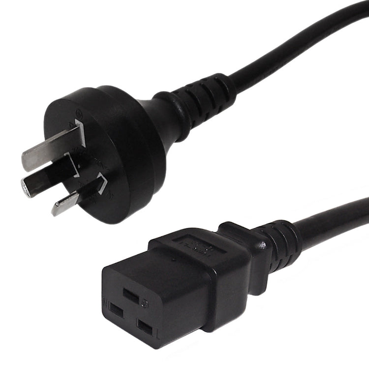 This power cord consists of a AS3112 male on one end and a C19 female on the other end. It is typically used to connect a server or UPS to a PDU or a wall outlet. These cables are constructed with UL mandated inner plastic frame molds to enhance terminal alignment and high quality molds. The connectors premium quality to ensure a snug fit into PDU receptacles. Each assembly is 100% continuity tested and 100% HVT (High Voltage) tested and inspected before shipping.