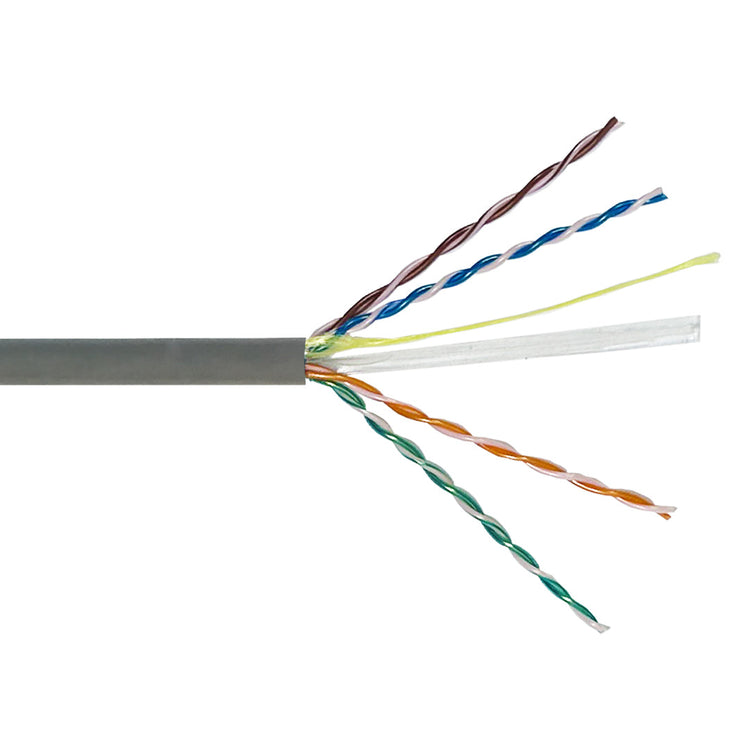 This bulk CAT6 plenum rated cable is 1000 feet in length and consists of 4 pairs of 23AWG solid bare copper wires. It is designed for use in data networking, PoE, security networking and voice applications. The cable is plenum (CMP) UL listed, RoHS Compliant and meets and/or exceeds CAT6 TIA/EIA 568 C.2 standards. It is typically used in plenum environments as premise wiring and terminated from a patch panel to a Cat6 jack.