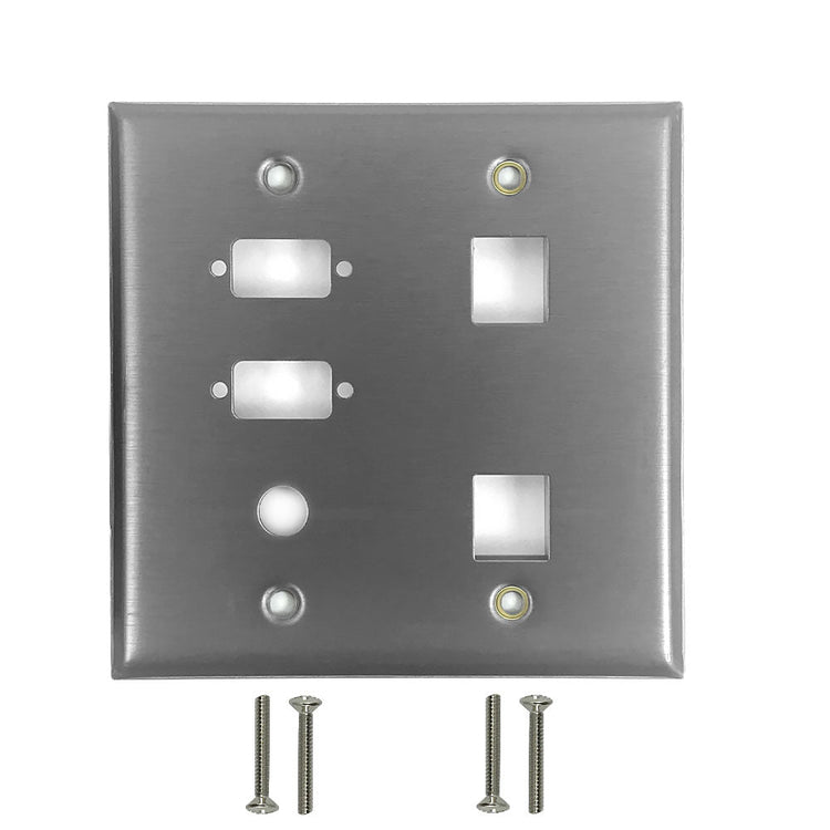 This wall plate consists of two ICDB size openings plus a 3/8 inch hole and two standard keystones holes. It is a standard North American wall plate which accepts a variety of our ICDB style couplers or dongles (such as HDMI, VGA, USB and DisplayPort), 3/8 inch sized couplers (such as RCA, F-Type and 3.5mm) and standard keystone inserts.