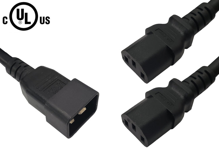 This power cord consists of a C20 male on one end and two C13 females on the other end. It is typically used on devices with multiple power supplies sharing one receptacle. These cables are constructed with UL mandated inner plastic frame molds to enhance terminal alignment and high quality molds. The connectors premium quality to ensure a snug fit into PDU receptacles. Each assembly is 100% continuity tested and 100% HVT (High Voltage) tested and inspected before shipping.
