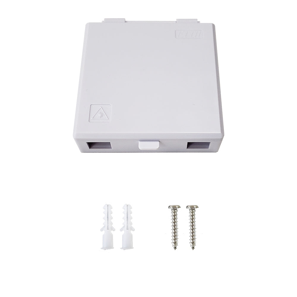 This plastic indoor fiber optic terminal box has a latching top for easy access and accepts up to 2 fiber optic panel mount couplers. It is used to interconnect fiber splices and terminated fiber cables. The unit comes with mounting hardware and supports cable management.