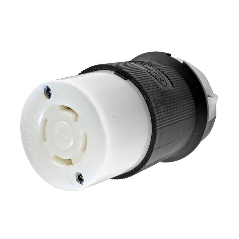 This L15-30R power cord connector is a 3-pole 4-conductor grounding heavy-duty plug. The tough nylon body provides impact and chemical resistance. The powerful offsetting cord grip clamps on individual conductors and outer cord jackets prevent strain on the terminals.