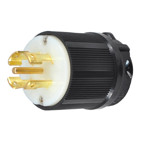 This L21-30P power cord connector is a 4-pole 5-conductor grounding heavy-duty plug. The tough nylon body provides impact and chemical resistance. The powerful offsetting cord grip clamps on individual conductors and outer cord jackets prevent strain on the terminals.
