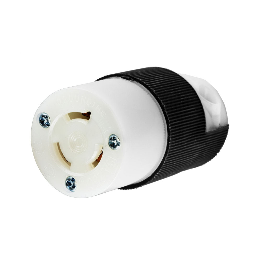 This L6-15R power cord connector is a 2-pole 3-Wire grounding heavy-duty plug. The tough nylon body provides impact and chemical resistance. The powerful offsetting cord grip clamps on individual conductors and outer cord jackets prevent strain on the terminals.