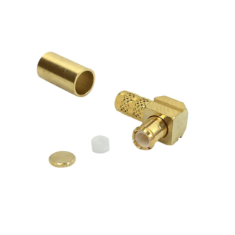 This MCX male right angle crimp connector is meant to be terminated on RG58 (LMR-195) bulk cable.