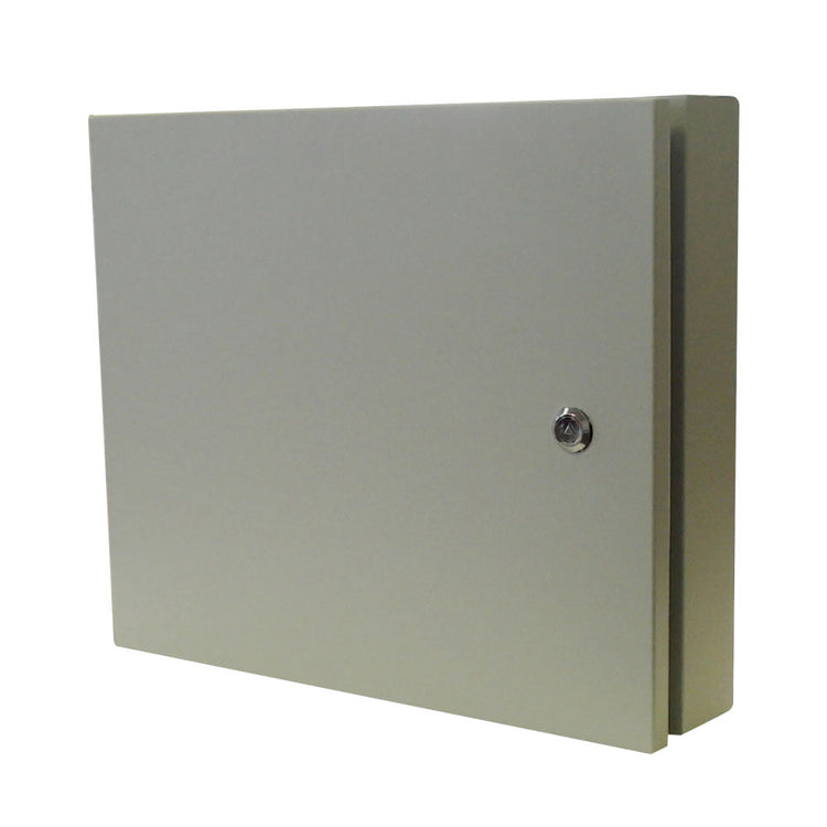 This wall mount fiber optic enclosure is meant for outdoor use and can accommodate up to 48 fiber connections. It is used to interconnect fiber splices and terminated fiber cables. The unit comes with four 12-fiber splice trays, four cable routing clamps, two cable clamps, 48 splice sleeves, four 6 port blank adapter panels, cable ties and mounting hardware.