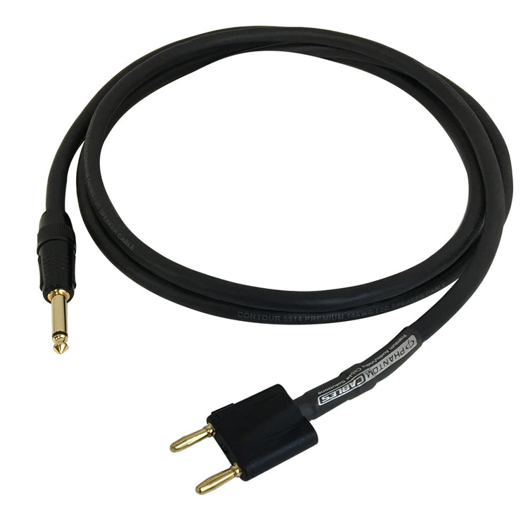 This audio speaker cable has a dual banana clip male connector on one end and a 1/4 inch TS male connector on the other. It is typically used to connect pro audio speakers to amplifiers.