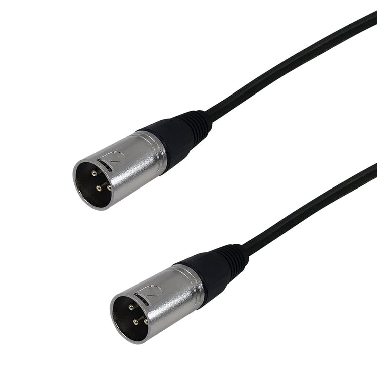 This premium 3-pin DMX lighting cable has a 3-pin XLR male on one end and a 3-pin XLR male on the other. It is typically used to control stage lighting and effects.