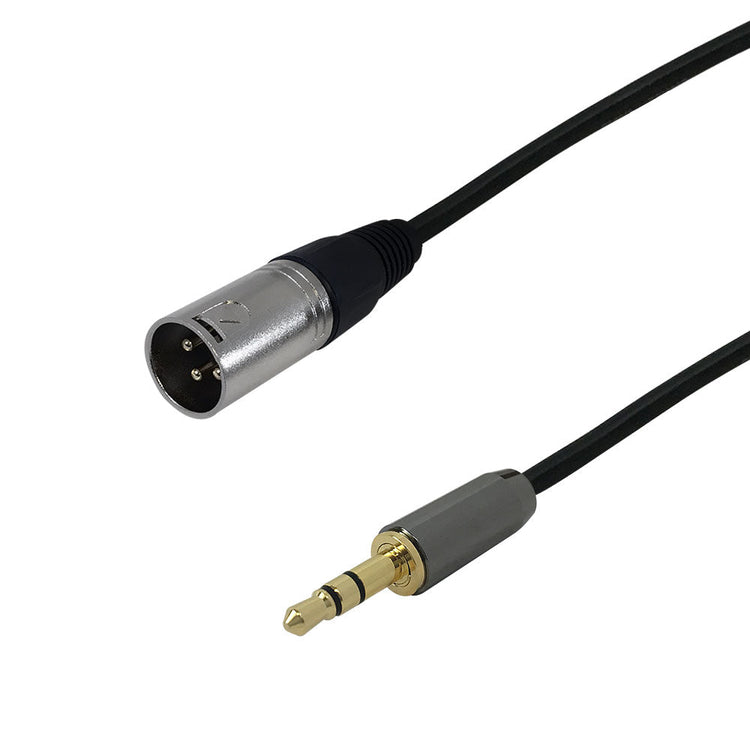 This premium stereo audio cable has a XLR male on one end and a 3.5mm male on the other. It is typically used to connect a microphone to an audio input such as on a PC or video camera.
