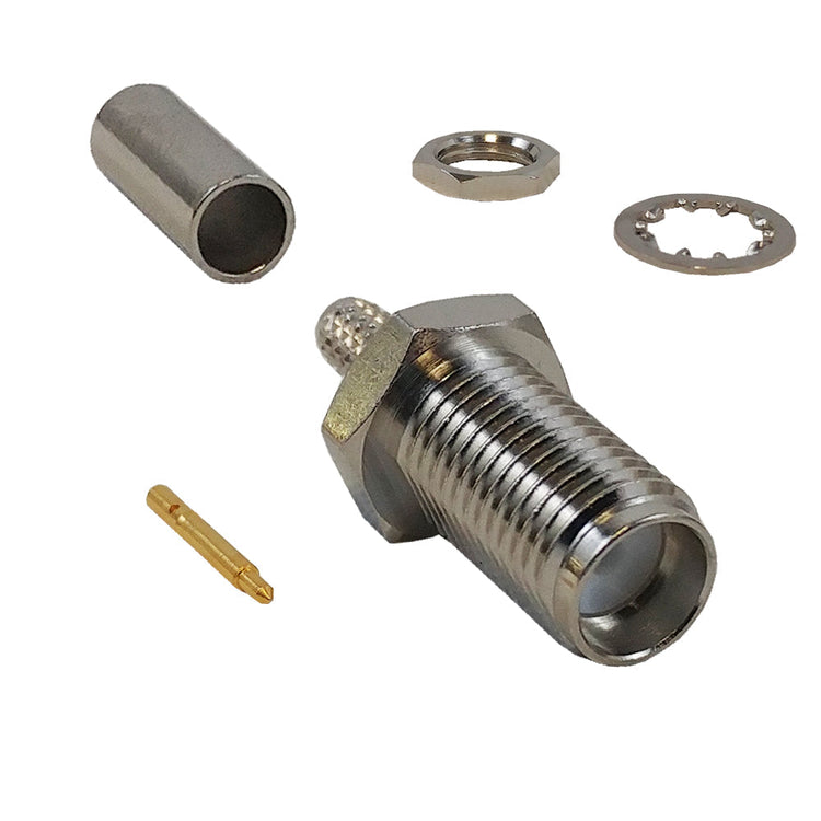 This SMA female reverse polarity bulkhead crimp connector is meant to be terminated on RG174 (LMR-100) bulk cable.